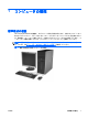 1 コンピュータの機能 標準構成の機能 HP Compaq dc7900 MT の機能は、モデルによって異なる場合があります。お使いのコンピュータに 取り付けられているハードウェアおよびインストールされているソフトウェアの一覧を表示するに は、診断用ユーティリティを実行します(一部のモデルのコンピュータにのみ付属しています)。ユ ーティリティの使用手順については、 『トラブルシューティング ガイド』を参照してください。 注記: 縦置き/横置き共用型コンピュータは、簡単に横置き構成に変えることができます。詳しく は、このガイドの45 ページの 「縦置きから横置きへの変更」を参照してください。 図 1-1 縦置き/横置き共用型コンピュータの構成 JAWW 標準構成の機能 1