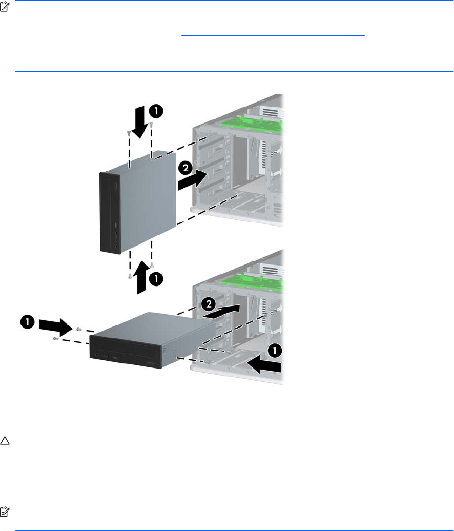 Bild 2-26 Installera en 5,25-tumsenhet i en minitower (upptill) och en bordsdator (nedtill)