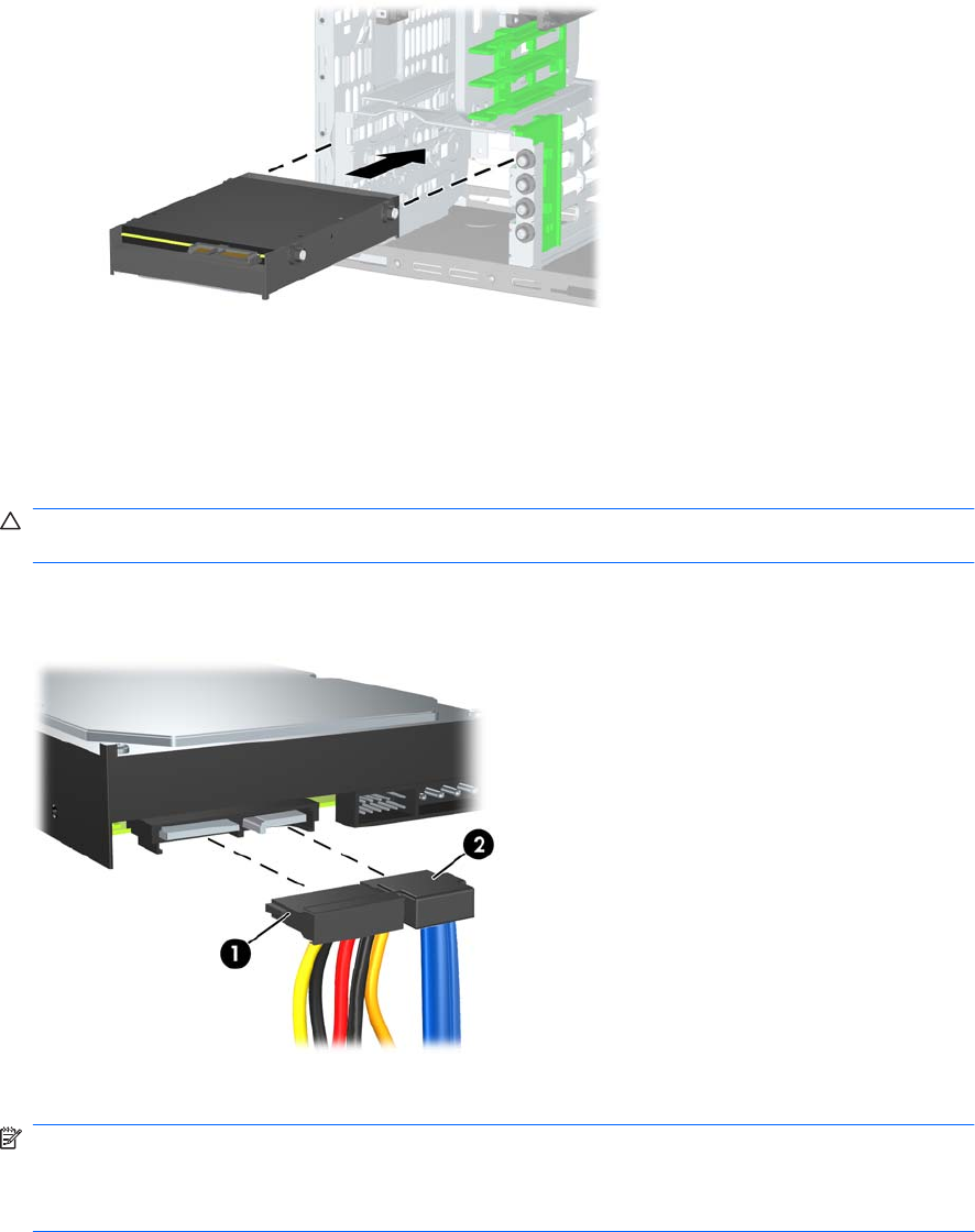 8. Anslut ström (1) - och data (2) kablarna till hårddiskens baksida.