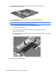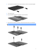 8. Vend computeren med skærmen opad, og fjern derefter de to skruer fra computerens bagkant. 9. Åbn computeren helt. 10. Skyd kontaktdækslet lige bagud mod skærmen, og fjern det derefter. 11. Fjern skruerne fra tastaturet. Computeren er forsynet med to eller tre skruer, som skal fjernes. BEMÆRK: Se den illustration, der ligner din computer mest.