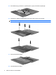8. Vend datamaskinen med skjermsiden opp, og fjern deretter de 2 skruene i bakre kant av datamaskinen. 9. Åpne datamaskinen så langt det er mulig. 10. Skyv bryterdekselet rett bakover mot skjermen, og fjern deretter bryterdekselet.