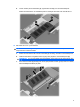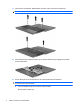 11. Fjern skruene fra tastaturet. Datamaskinen har enten 2 eller 3 skruer som må fjernes. MERK: Se på illustrasjonen som er mest i samsvar med din datamaskin. 12. Skyv tastaturet (1) mot skjermenheten, og snu deretter tastaturet opp-ned (2) for å avdekke minnemodulrommet. 13. Hvis du skal bytte ut en minnemodul, tar du ut den nåværende minnemodulen: FORSIKTIG: For å unngå skade på minnemodulen må du bare holde i kanten på den. Ikke ta på komponentene til minnemodulen. a.