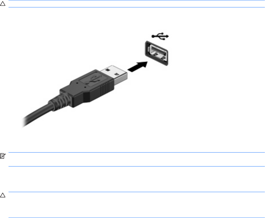FORSIGTIG: Anvend minimal kraft til at tilslutte en USB-enhed for at undgå at beskadige USB-stikket.