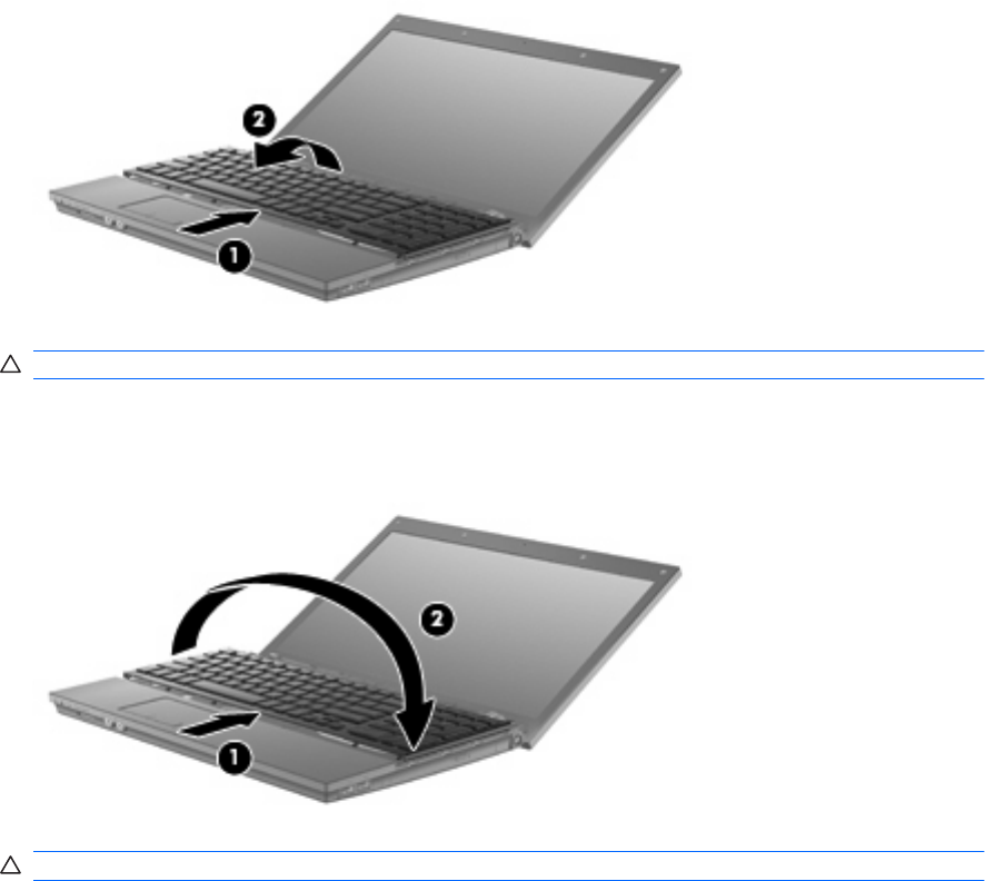 14 インチのコンピューターの場合は、キーボードをディスプレイの方向にスライドさせ(1)、