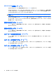 機能 ホットキー スピーカーの音を消す(ミュート) fn + f9 スピーカーの音量を下げる fn + f11 スピーカーの音量を上げる fn + f12 ホットキー コマンドをコンピューターのキーボードで使用するには、以下のどちらかの操作を行いま す。 ● 短く fn キーを押してから、ホットキー コマンドの 2 番目のキーを短く押します。 または ● fn キーを押しながらホットキー コマンドの 2 番目のキーを短く押した後、両方のキーを同時に 離します。 ヘルプを開く(fn + f1) fn + f1 ホットキーを押すと、実行中のプログラムのヘルプが表示されます。 [Print Options](印刷オプション)アプリケーションを起動する(fn + f2) fn + f2 ホットキーを押すと、[Print Options]アプリケーションが起動します。 Web ブラウザーを開く(fn + f3) Web ブラウザーを開くには、fn + f3 を押します。 インターネットまたはネットワーク サービスを設定するまで、fn + f3 ホットキーを押すとインター ネット接続ウィザード