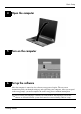 Basic Setup 4 Open the computer 5 Turn on the computer 6 Set up the software After the computer is turned on, the software setup process begins. The on-screen instructions guide you through setting up and registering your computer. After you respond to the setup prompt, you must complete the entire setup process without interruption. select your language carefully. On some models, the languages you do not ✎ Please choose are deleted from the system and cannot be restored during software setup.
