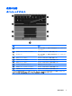 名称 (9) (10) 説明 バッテリ ランプ ドライブ ランプ ● オレンジ色に点灯:バッテリが充電中です ● 青緑色に点灯:バッテリが完全充電時に近い状態です ● オレンジ色で点滅:電源にバッテリのみを使用している状態 で、ロー バッテリ状態になっています。完全なロー バッテ リ状態になった場合は、バッテリ ランプがすばやく点滅し 始めます ● 消灯:コンピュータが外部電源に接続されている場合は、コ ンピュータのすべてのバッテリが完全に充電されるとバッテ リ ランプが消灯します。コンピュータが外部電源に接続さ れていない場合は、ロー バッテリ状態になるまでランプが 消灯したままになります ● 点滅:ハードドライブまたはオプティカル ドライブにアク セスしています ● オレンジ色に点灯:[HP 3D DriveGuard]によってハードドラ イブが一時停止しています *電源ランプは 2 つあり、両方とも同じ情報を通知します。電源ボタンのところにある電源ランプはコンピュータを開いてい るときにのみ見えます。コンピュータの前面にある電源ランプは、コンピュータを開いているときも閉じ
