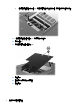 將記憶體模組加入擴充記憶體模組插槽,或更換其中的記憶體模 組 警告! 若要避免觸電或損壞設備的風險,請先拔下電源線並取出所有電池,然後再安裝記憶體模組。 注意: 釋放靜電 (ESD) 會使電子組件受損。在開始執行任何程序之前,您必須先觸碰接地的金屬物 件,以確定釋放身上的靜電。 若要將記憶體模組加入擴充記憶體模組插槽,或更換其中的記憶體模組,請依照下列步驟執行: 1. 儲存您的工作內容。 2. 關閉電腦並闔上顯示器。 如果您不確定電腦是否已關機或在休眠模式,請先按下電源按鈕以啟動電腦, 然後再透過作業系 統來關閉電腦。 3. 中斷所有外接式裝置與電腦的連接。 4. 將電源線從 AC 電源插座拔下。 5. 請將電腦翻轉,以底部朝上放置於平面。 6. 將電池從電腦中取出。 7. 鬆開記憶體模組槽外蓋螺絲 (1)。 8.