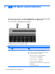 3 使用 HP Quick Launch Buttons 使用 HP Quick Launch Buttons,可以快速打开经常使用的程序、文件或网站。您可以使用下表中描述 的出厂设置。或者打开 Quick Launch Buttons 控制面板中的 Q Menu,重新定义按钮。 Quick Launch Buttons 包括信息按钮 (1) 和演示按钮 (2)。 下标描述了 Quick Launch Buttons 的出厂设置。 注: (1) 按钮功能根据您笔记本计算机上安装的软件的不同而有所不同。 组件 说明 信息按钮 启动“信息中心”,该中心提供诸如以下功能的快捷方式: 注: 6 第 3 章 使用 HP Quick Launch Buttons 您的笔记本计算机型号可能不支持下面所列的某些功能。 ● HP Wireless Assistant(HP 无线助手) ● HP ProtectTools Suite(HP 安全防护工具套件) ● HP 3D DriveGuard(HP 3D 硬盘保护) ● HP Recovery Manager(HP 恢复管理器) ●