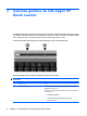 3 Uporaba gumbov za hitri zagon HP Quick Launch Uporabite gumbe za hitri zagon HP za hitro odpiranje programov, datotek ali spletnih mest, ki jih pogosto uporabljate. Uporabite lahko tovarniške nastavitve, ki so opisane v tabeli. Lahko pa programirate gumbe tako, da odprete meni Q na nadzorni plošči z gumbi za hitri zagon Quick Launch. Gumbi za hitri zagon vključujejo gumb za informacije (1) in gumb za predstavitev (2). Naslednja tabela opisuje tovarniške nastavitve za gumbe za hitri zagon.