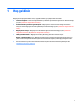 Özel işlev tuşları Bileşen Açıklama (1) esc tuşu fn tuşuyla birlikte basıldığında sistem bilgilerini görüntüler. (2) fn tuşu Bir işlev tuşu, num lock tuşu veya esc tuşuyla birlikte basıldığında sık kullanılan sistem işlevlerini çalıştırır. Bkz. Kısayol tuşlarını kullanma, sayfa 10. (3) Windows tuşu Başlat menüsünü açar. NOT: Windows tuşuna tekrar basıldığında Başlat menüsü kapanır. (4) num lock tuşu Sayısal tuş takımını açar ve kapatır.
