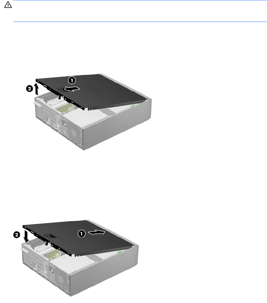 6. Pabīdiet piekļuves paneļa rokturi datora aizmugures virzienā (1) tad paceliet un noņemiet