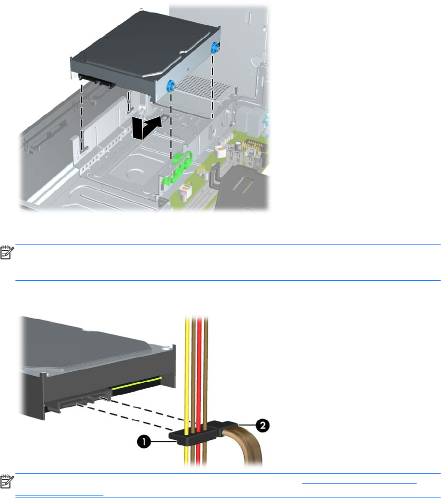 13. Pievienojiet strāvas (1) un datu kabeli (2) cietā diska aizmugurē.