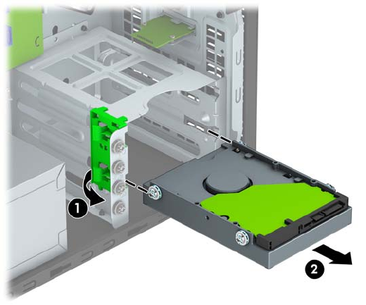 7. Povucite prema van zeleni zasun koji se nalazi do pogona (1) i gurnite pogon iz ležišta (2).