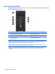 - Deli na sprednji plošči Konfiguracija pogonov se lahko razlikuje glede na model računalnika. Nekateri modeli imajo zaščitno ploščo, ki pokriva ležišče optičnega pogona. 1 Tanek optični pogon (izbirno) 6 Bralnik kartic SD (dodatno) 2 Gumb za napajanje z dvema stanjema 7 Lučka za dejavnost trdega diska 3 Napajalna vrata USB 2.0 (za polnjenje; črna) 8 Vrata USB 2.0 (črna) 4 Vrata USB 3.