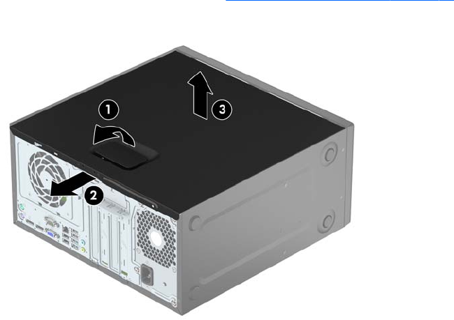 2. Pull up the access panel handle (1), and then slide the panel back (2) and lift it o the computer (3).