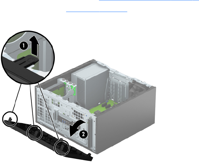 3. Lift up the three tabs on the side of the bezel (1), and then rotate the bezel o the chassis (2).