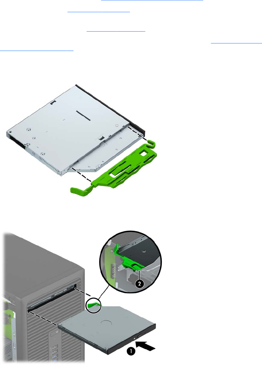 6. Slide the optical drive through the front of the chassis (1) all the way into the bay so that the green latch
