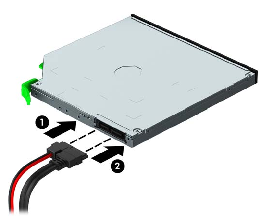 7. Connect the power cable (1) and data cable (2) to the rear of the optical drive.