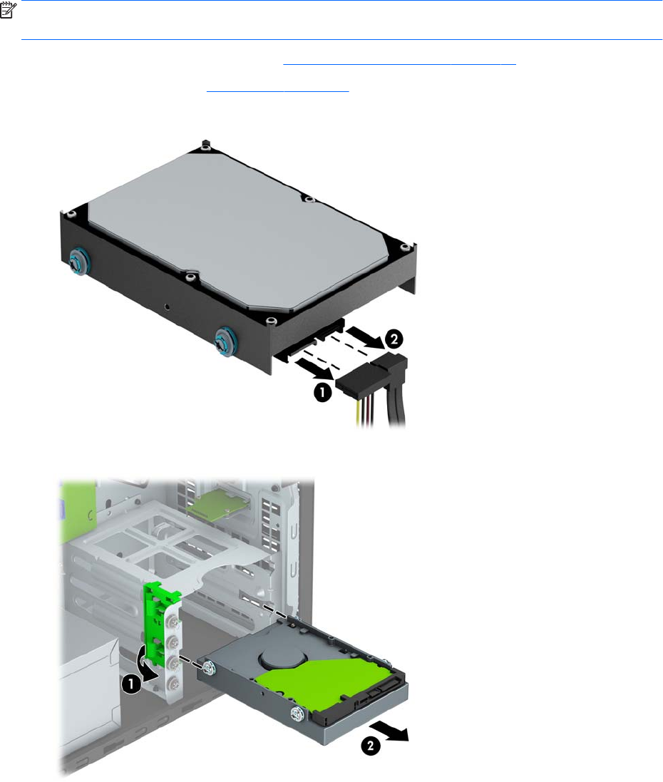 3. Disconnect the power cable (1) and data cable (2) from the rear of the hard drive.