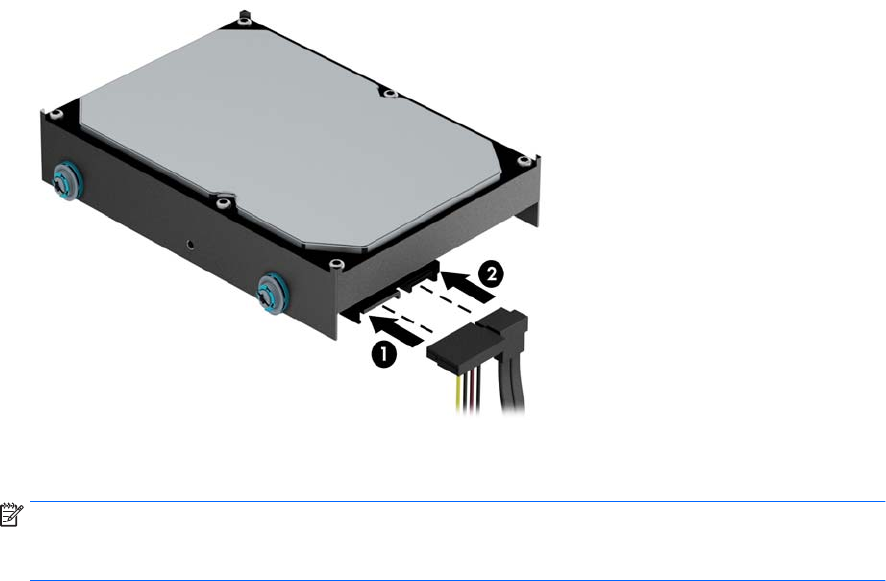6. Connect the power cable (1) and data cable (2) to the rear of the hard drive.