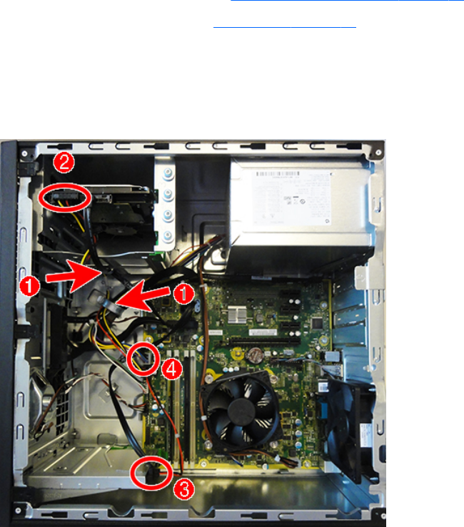 5. Disconnect the cable from the system board connector labeled SATAPWR0 (4), and then remove the