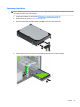 3. Remove the cable from the clips on the base pan and on the side of the hard drive cage (1).