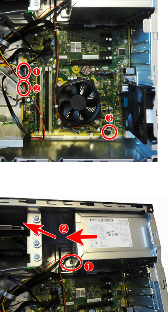 7. Slide the power supply toward the front of the computer, rotate toward the fan so the power supply
