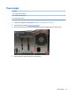 6. Press the tab (1) on the base pan in front of the power supply that holds it in place.