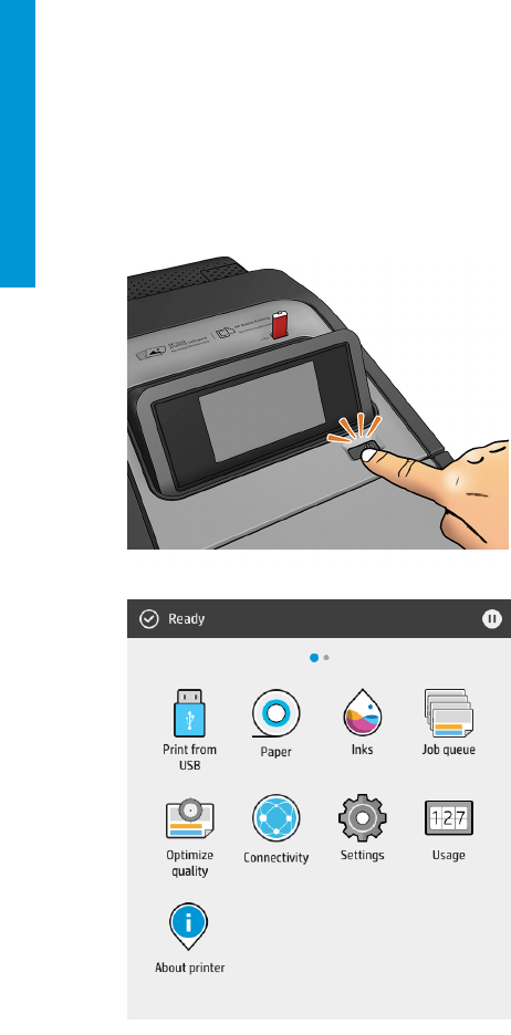 Under frontpanelet findes tænd/sluk-knappen, som du bruger til at tænde og slukke for printeren. Knappen lyser,