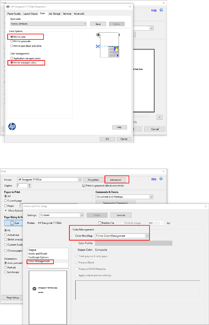 6. If you have a V3 driver, click the Advanced button in the Print dialog box, set Color Handling to Printer Color