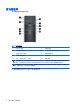 前面板组件 驱动器配置可能因机型而异。 表 1-1 前面板组件 1 5.25 英寸光驱 1 6 光驱弹出按钮 2 光驱活动指示灯 7 3.5 英寸介质卡读卡器(可选)2 3 硬盘驱动器活动指示灯 8 双重状态电源按钮 4 麦克风/耳机连接器 9 开机指示灯 5 USB(通用串行总线)2.0 端口 10 耳机连接器 注: 在将设备插入麦克风/耳机连接器时,将会弹出一个对话框,询问您是要将该连接器用于麦克风线路输入设备,还 是用于耳机。您可以随时双击 Windows 任务栏中的 Realtek HD Audio Manager 图标以重新配置该连接器。 注: 接通电源时,开机指示灯一般呈绿色。如果指示灯呈红色闪烁,则计算机出现了问题,它会显示一个诊断代码。 请参阅《故障排除指南》来查看相应问题的解释。 2 1 某些机型有遮盖一个或两个 5.25 英寸驱动器托架的挡板。 2 某些机型具有空闲挡板,用于遮盖 3.