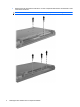 8. Drehen Sie den Computer mit dem Display nach oben, und entfernen Sie die beiden Schrauben von der Rückseite des Computers. 9. Öffnen Sie den Computer so weit wie möglich. 10. Schieben Sie die Abdeckung oberhalb der Tastatur nach hinten in Richtung Display, und entfernen Sie die Abdeckung.