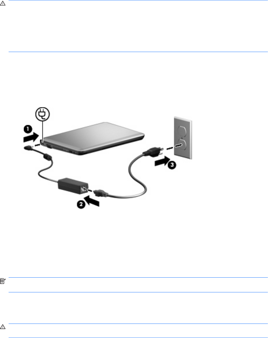 如果電腦安裝了充電電池,並且使用外接式 AC 電源供應器提供的 AC 電源工作,當將 AC 電源供應器