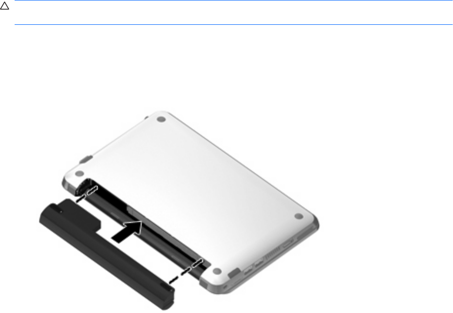 將電池上的定位片對準電腦上的缺口,然後將電池插入電池插槽。電池釋放閂會將電池自動鎖至定