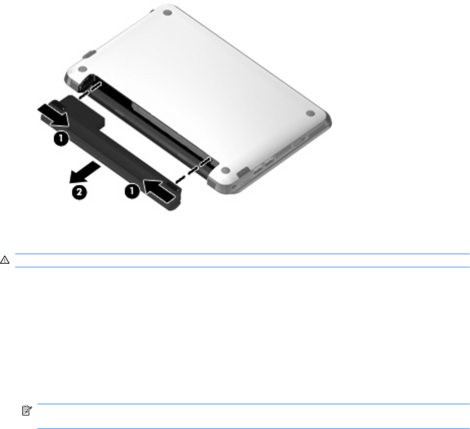 2. 拉開電池釋放閂 (1),以鬆開電池,然後取出電池 (2)。