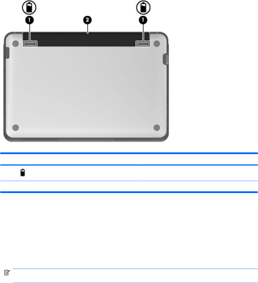 (1) Pestillos de liberación de la batería (2) Liberan y fijan la batería en el compartimiento de la batería.