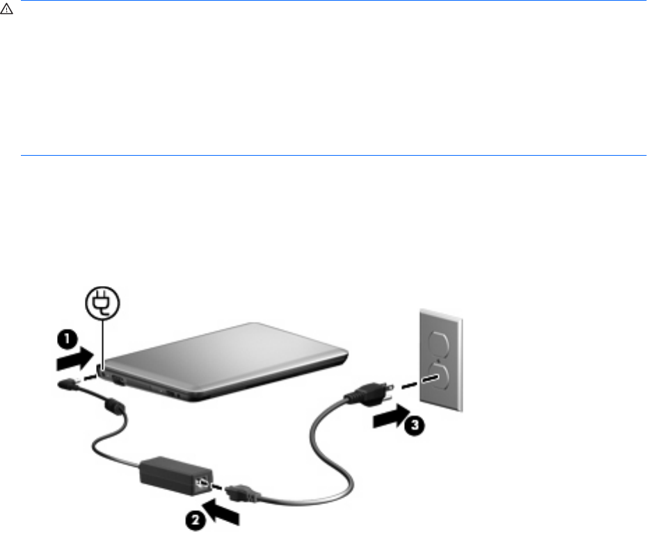 1. Conecte o adaptador de CA no conector de alimentação (1) do computador.