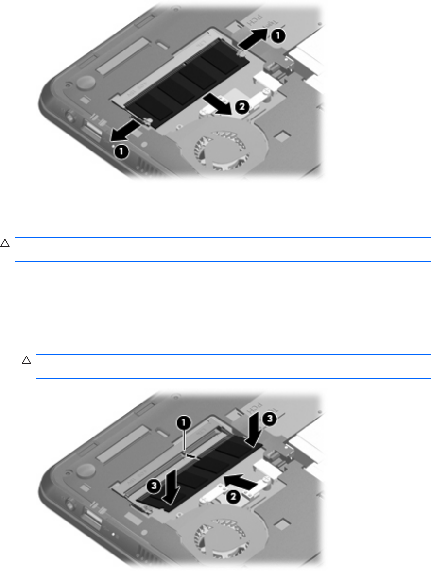 b. Grasp the edge of the memory module (2), and gently pull the module out of the memory