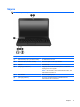 Komponenter på fronten Komponent Beskrivelse (1) Gjengir lyd når du kobler til stereohøyttalere, hodetelefoner, øreplugger eller fjernsynslyd. Lydutgang (hodetelefoner) MERK: Når du kobler en enhet til hodetelefonkontakten, slås datamaskinens høyttalere av. 10 (2) Intern mikrofon Brukes til innspilling av lyd. (3) Lydinngang (mikrofonkontakt) Her kan du eventuelt koble til en hodetelefonmikrofon, stereomikrofon eller monomikrofon.