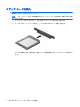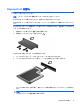 メディア カードの挿入 注意: SD カードおよびコンピューターの損傷を防ぐため、SD カード スロットには、どのような 種類のアダプターも挿入しないでください。 注意: メディア カード コネクタの損傷を防ぐため、メディア カードの挿入時に必要以上の力を加 えないでください。 1. メディア カードのラベルを上にし、コネクタをコンピューター側に向けて持ちます。 2.