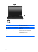 Komponenta Opis (1) Lučka Caps lock Sveti: tipka Caps lock je vklopljena. (2) Lučka za brezžično povezavo ● Modra: vklopljena je vgrajena brezžična naprava, npr. naprava brezžičnega krajevnega omrežja (WLAN) in/ali naprava Bluetooth®. ● Rumena: vse brezžične naprave so izklopljene. ● Sveti: računalnik je vklopljen. ● Utripa: računalnik je v varčevalnem načinu. ● Off (Izklop): računalnik je izklopljen ali v stanju mirovanja.