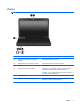 Komponenta Opis (1) Lučka spletne kamere (samo pri izbranih modelih) Sveti: Spletna kamera je v uporabi. (2) Spletna kamera (samo pri izbranih modelih) Snema videoposnetke in posname fotografije. (3) Zvočnik Proizvaja zvok. (4) Priključek za izhod zvoka (slušalke) Proizvaja zvok, ko je priključen v stereo zvočnike z dodatnim napajanjem, v slušalke, ušesne slušalke ali televizijo. OPOMBA: Ko je v priključek za slušalke vključena naprava, so zvočniki računalnika onemogočeni.