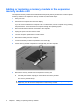 1 Adding or replacing memory modules The computer has one memory module compartment, which is located on the bottom of the computer. The memory capacity of the computer can be upgraded by adding a memory module to the vacant expansion memory module slot or by upgrading the existing memory module in the primary memory module slot. WARNING! To reduce the risk of electric shock and damage to the equipment, unplug the power cord and remove all batteries before installing a memory module.