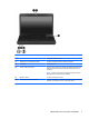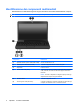Componente Descrizione (1) Spia della webcam (solo in determinati modelli) Accesa: la webcam è in uso. (2) Webcam (solo in determinati modelli) Consente di registrare filmati e scattare fotografie. (3) Altoparlante Produce il suono. (4) Jack di uscita audio (cuffie) Produce il suono quando si collegano altoparlanti stereo alimentati, cuffie, auricolari, una cuffia con microfono oppure l'audio di un televisore.