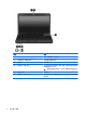 组件 说明 (1) 内部显示屏开关 如果面板盖已合上,则关闭显示屏(尽管显示屏接通电源)。 (2) 无线设备按钮 启用或禁用无线功能,但不建立无线连接。 注: (3) 电源按钮 您必须设置或访问无线网络以建立无线连接。 ● 当笔记本计算机关闭时,按此按钮可打开计算机。 ● 当笔记本计算机开启时,按此按钮可关闭计算机。 ● 当笔记本计算机处于睡眠模式时,短按此按钮可退出睡眠模 式。 ● 当笔记本计算机处于休眠模式时,短按此按钮可退出休眠模 式。 要详细了解有关电源设置,请选择开始 > 控制面板 > 系统和维护 > 电源选项。 (4) 8 扬声器 第 2 章 组件 发出声音。