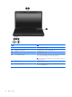 구성 설명 (1) 웹캠 표시등(일부 모델만 해당) 켜짐: 웹캠을 사용 중입니다. (2) 웹캠(일부 모델만 해당) 비디오를 녹화하고 스틸 사진을 캡처합니다. (3) 스피커 사운드를 재생합니다. (4) 오디오 출력(헤드폰) 잭 선택 사양인 전원 공급형 스테레오 스피커, 헤드폰, 이어폰, 헤드셋 또는 TV 오디오에 연결된 경우 사운드를 생성합니다. 주: 장치가 헤드폰 잭에 연결되어 있는 경우 컴퓨터 스피커는 사 용할 수 없습니다. 4 (5) 내장 마이크 사운드를 녹음합니다. (6) 오디오 입력(마이크) 잭 선택 사양인 컴퓨터 헤드셋 마이크, 스테레오 어레이 마이크 또는 모노 마이크를 연결합니다.