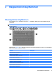 1 Osoitinlaitteiden käyttäminen Kohde Kuvaus (1) Kosketusalusta* Siirtää osoitinta sekä valitsee ja aktivoi näytössä olevia kohteita. (2) Kosketusalustan vasen painike* Toimii kuten ulkoisen hiiren ykköspainike. (3) Kosketusalustan vieritysalue Vierittää ylös- tai alaspäin. (4) Kosketusalustan oikea painike* Toimii kuten ulkoisen hiiren kakkospainike. * Taulukossa näkyvät tehdasasetukset.