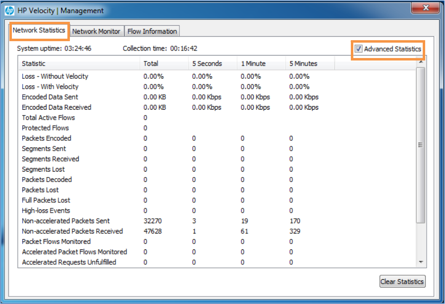 Figure 3. HP Velocity Management menu showing Network Statistics tab with Advanced Statistics selected.