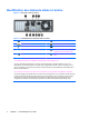 Clavier Figure 1-5 Éléments du clavier Tableau 1-4 Éléments du clavier 1 1 Touches de fonction Ces touches permettent d’effectuer des fonctions spéciales, selon l’application utilisée. 2 Touches d’édition Exemples : Inser, origine, Page précédente, Suppr, Fin et Page suivante. 3 Voyants d’état Indiquent l’état des paramètres de l’ordinateur et du clavier (Verr num, Verr maj et Arrêt défil). 4 Touches numériques Ces touches offrent la même fonction que le clavier numérique d’une calculatrice.